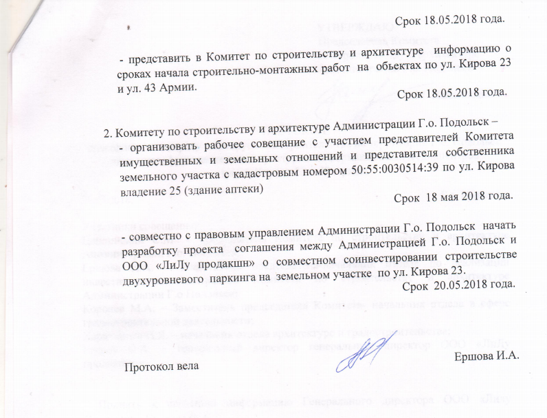 https://www.komstroi-podolsk.ru/news/n607.html26 апреля в Администрации Городского округа Подольск состоялось совещание с руководителем компании ООО «Лилу Продакшн» О.А.Егоровым. Встречу провел председатель Комитета по строительству и архитектуре С.М.Цаплинский. На встрече речь шла о планах компании-инвестора о строительстве кинотеатров в Подольске. Ранее неоднократно сообщалось о намерении ООО «Лилу продакшн» возвести на территории Городского округа Подольск двух многозальных кинотеатров на ул.Кирова и на ул.43-й Армии. До сих пор планы не осуществились, поскольку проект нормативного документа о предоставлении земельных участков застройщику в стадии рассмотрения Правительством Московской области.