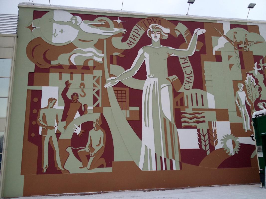 Удивилась изменившимся цветам на фреске кинотеатра Родина: оттенок, который раньше читался как желто - персиковый стал оливково-зелёным.