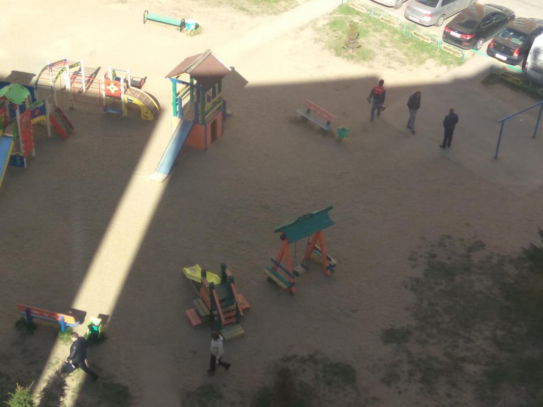 Еще год назад на месте детской площадки был пустырь где, по утверждению местных жителей, жарили шашлыки и выгуливали собак. Но за дело взялся Олег Соенко и построил детский мини-городок. Деньги на него соседи собирали всем миром.