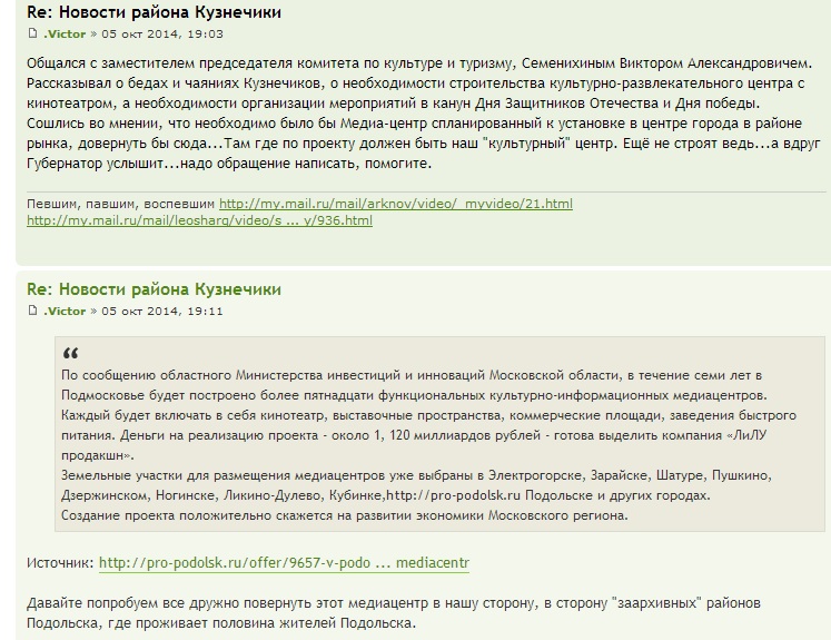 © http://www.podolsk24.net/forum/viewtopi ... 03#p310003Общался с заместителем председателя комитета по культуре и туризму, Семенихиным Виктором Александровичем.