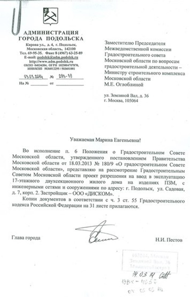 архитектуре г.Подольска, о причинах задержки в приемки дома. В официальном ответе