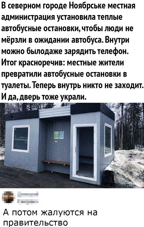 http://www.yamalpro.ru/2019/04/10/v-noy ... ln-rubley/Четыре теплые автобусные остановки в Ноябрьске, каждая из которых обошлась бюджету в 380 тыс рублей, вандалы превратили в общественные туалеты. Кроме того, ни у одной из остановок на данный момент не осталось дверей.