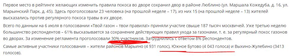 Голосование «Твой газон – твои правила!» длилось восемь недель. Отметим, что на протяжении всего хода голосования ни один двор не выбрал большинством вариант отказаться от покоса травы. Этот вариант был поддержан всего 69 тысячами горожан, что составляет меньше трети голосовавших – 29 процентов.