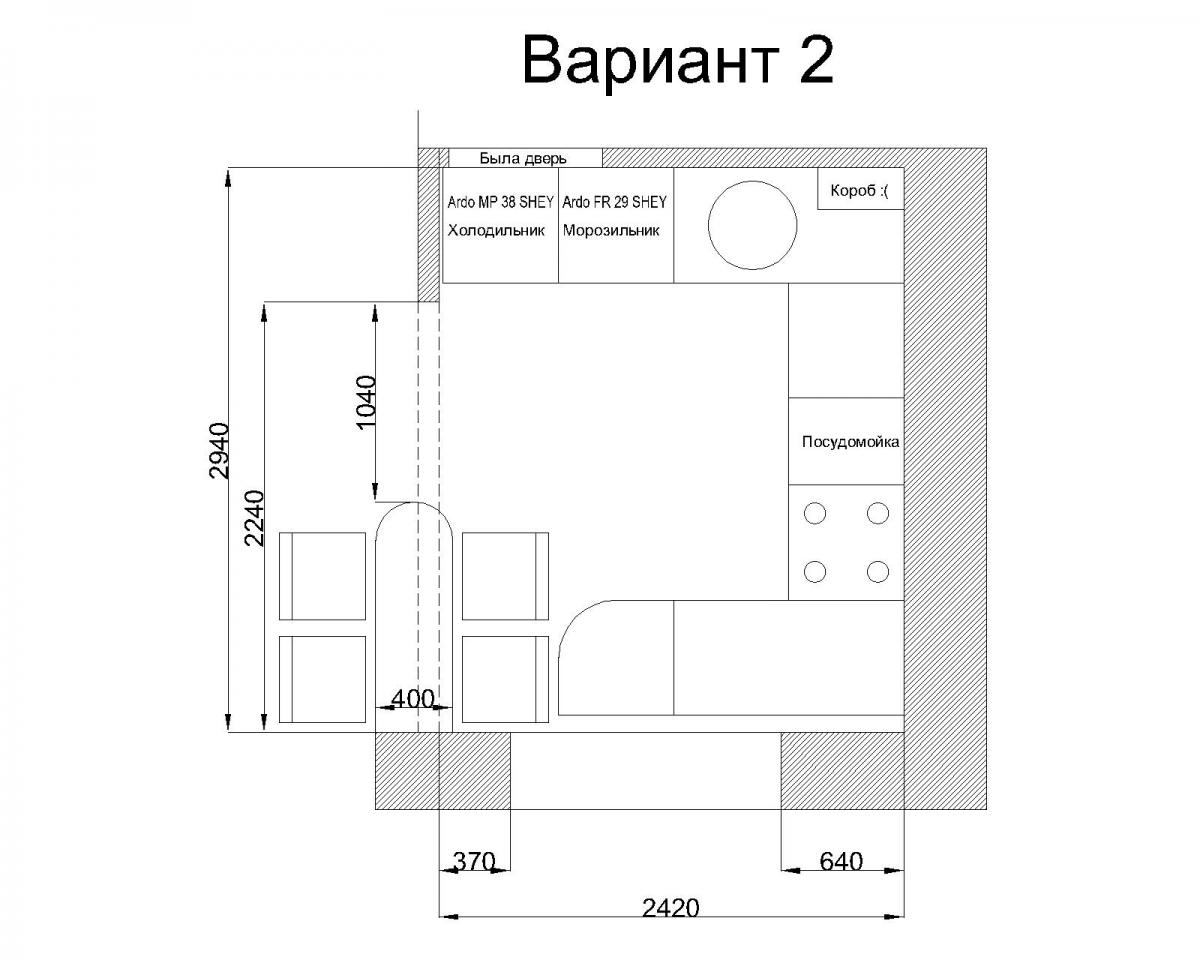 Ещё я бы плиту с посудомойкой поменял бы местами. Чтобы кухня получилась симметричная и как бы делилась пополам плитой + красивой вытяжкой или шкафом над плитой, если смотришь на неё из комнаты. А то вбок вправо будет симметрия сдвинута. Некрасиво