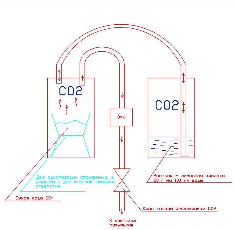 находится тема по созданию на коленках из ничего отличной установки со2.Это не баллон,конечно,но и не пресловутая брага. Это ,скорее,газ "по взрослому". Совершенно свободно можно применять с любыми реакторами,в частности с рябиновой веточкой,можно приклеить манометр,электромагнитный клапан.В первой схеме слишком много деталей,она менее надёжна, из за большого количества соединений,качества клапанов. Вторая обеспечивает аквариум не более 100 литров. Делал,подтверждаю.