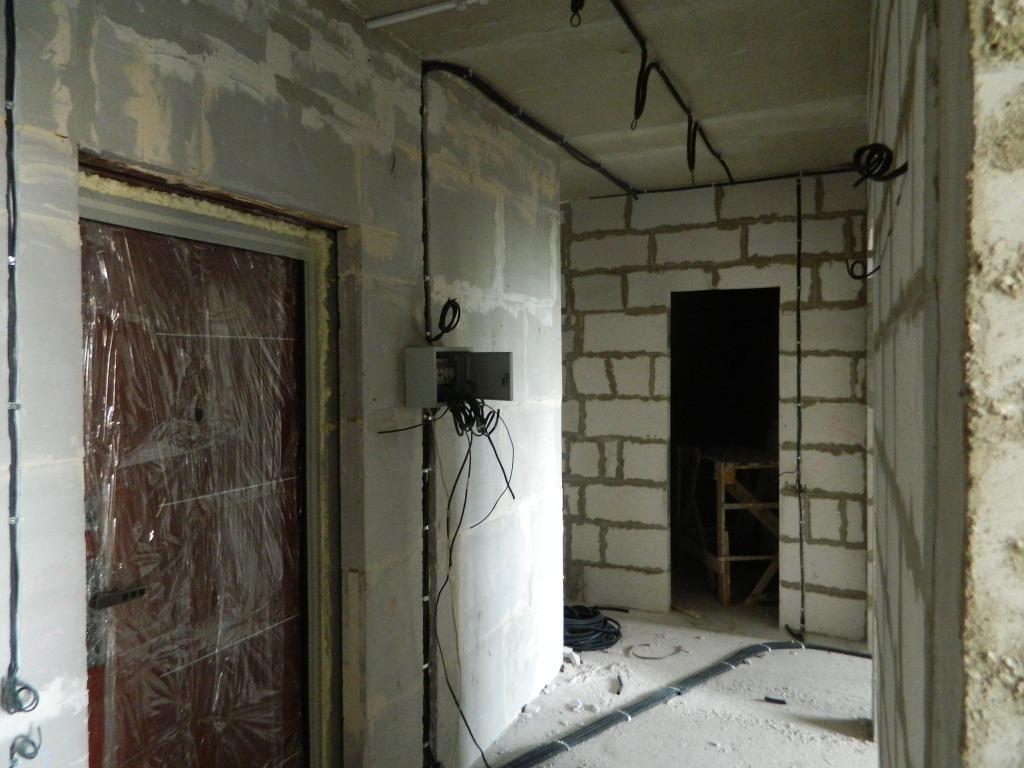 Первый этап - прокладка проводов в гофротрубе по полам, по потолкам, по стенам, штробление. Также прокладываются телевизионные провода и интернет. Далее монтируется несколько розеток и временное освещение для строителей.