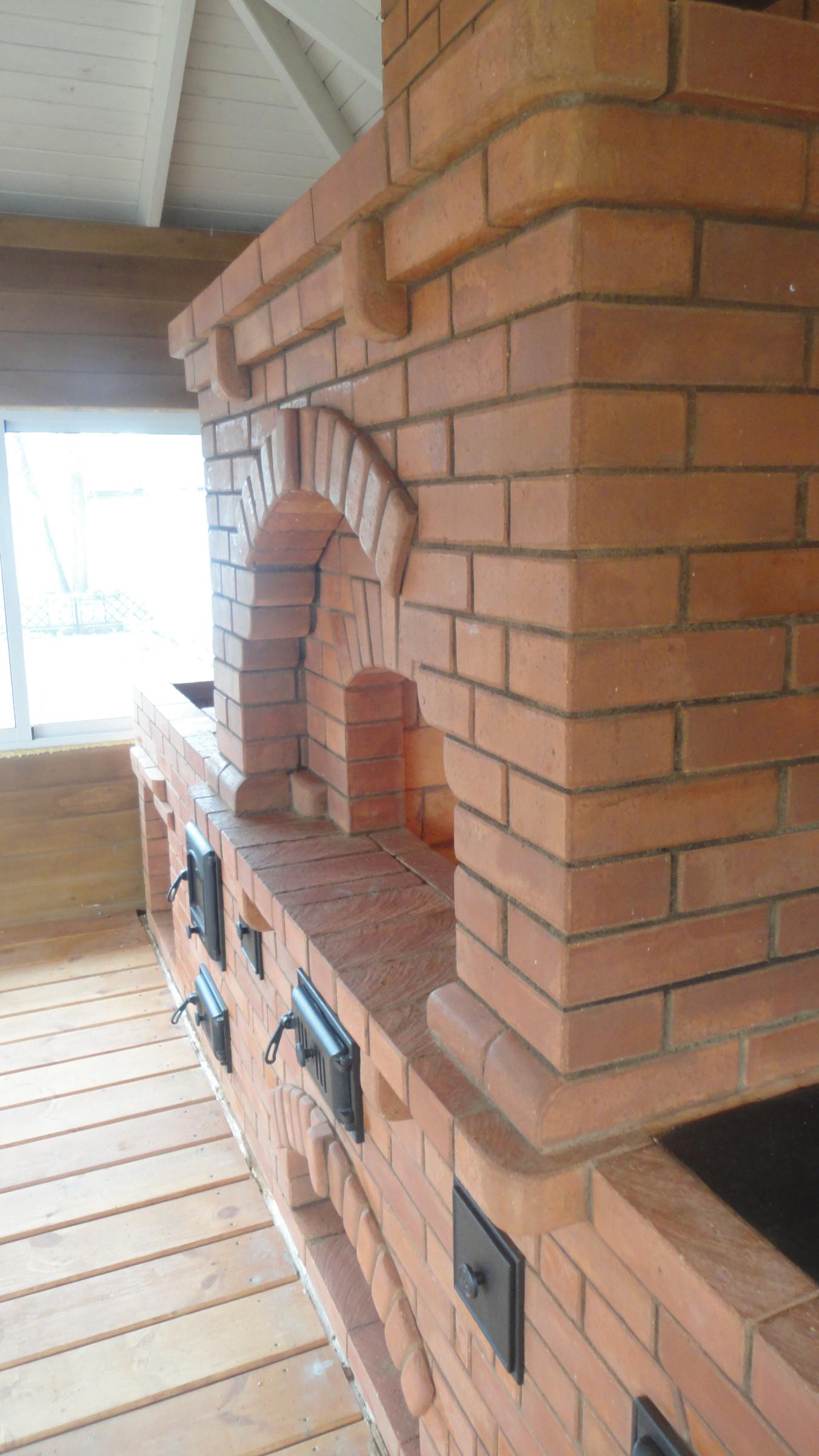 Теперь о том, что же Вас ждет если Вы решились сделать себе печь или другую печную конструкцию. Первоначальный этап выбор конструкции я думаю мы уже обсудили.Следующим этапом мы выбираем материал и фурнитуру,и производим расчет его колличества.Выбор в настоящее время очень богатый.И вопрос этот так же индивидуален.Отмечу лишь что подобрав материал,он приедет к нам сам, по списку.Дальше идет подготовка рабочих мест. Т.к. в ходе возведения очага идет очень много резки кирпича, его обработка.То первым делом возводится место для обработки кирпича,с возможностью предотвращения пыления на дом или элементы участка.Такое место позволяет не зависеть от погодных условий и работать непрерывно и в снег, и в дождь.Подготавливается фурнитура, место работы и вперед.В среднем работа над стандартной печью или камином доходит до одного месяца.Работа над комплексом разного назначения от 1500 до 3500 кирпичей от 1,5 до 2,5 месяцев.Поэтому намекну, что крупные многофункциональные комплексы или комплексы на 2 этажа,индивидуальные,штучные, с большим количеством резных элементов, лучше делать в спокойные зимние месяцы, когда есть время творить
