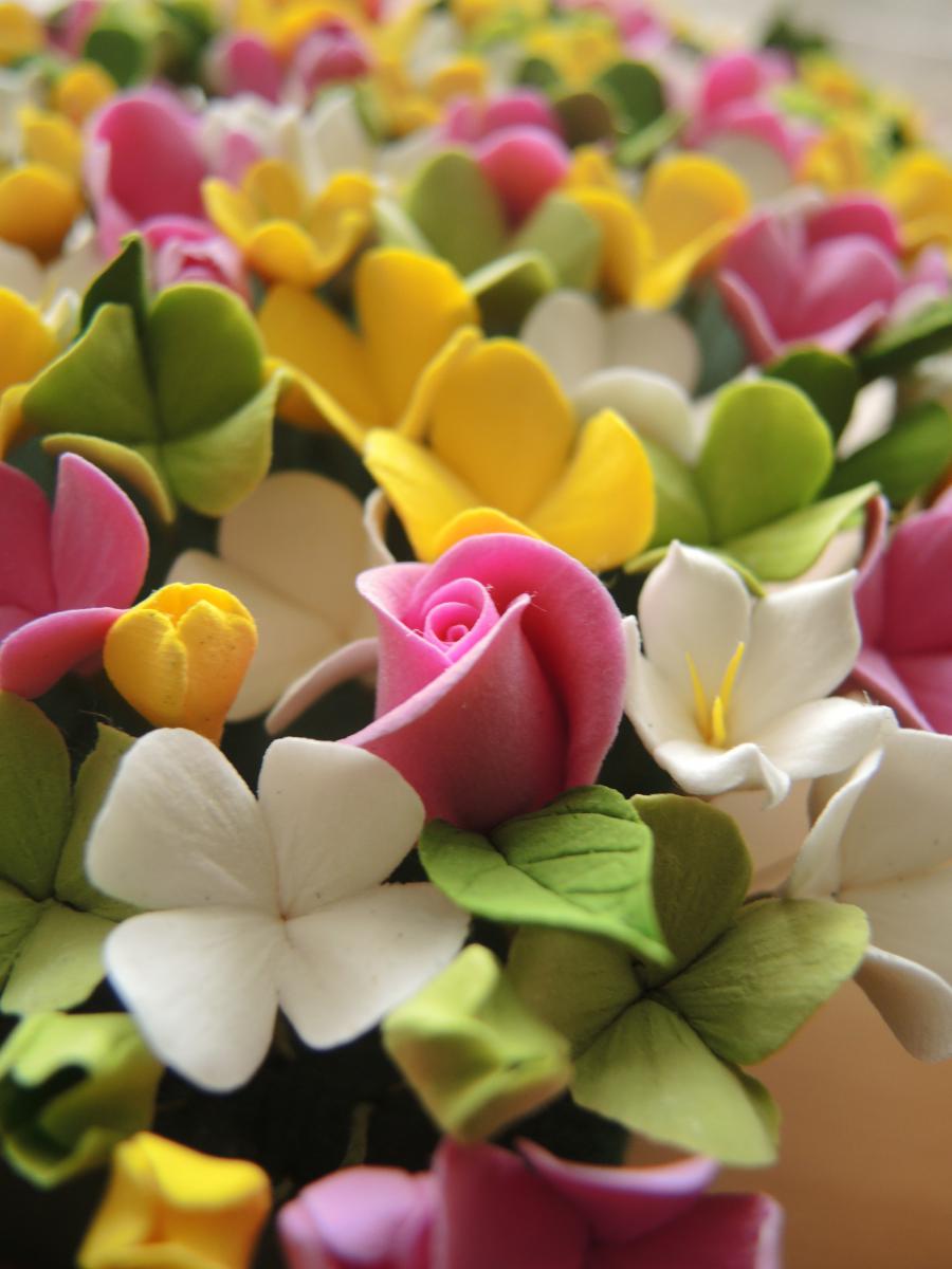 Да, цветы из глины не заменят живых, но и у них есть кое-какие преимущества. Эти цветы прочные и очень легкие. Такой свадебный букет для невесты не составит никакого труда держать весь день в руках, не надо переживать о том, что он завянет или помнется. Он сохранит свежий вид не только во время всего праздника, но и будет радовать вас долгие годы, напоминая о самом важном дне вашей жизни.