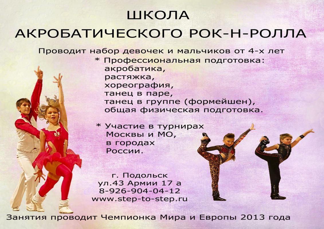 Все лето ждем детей от 4 лет на профессиональные занятия по акробатике и рок-н-роллу, от 6 лет на подготовку к школе, 4-12 лет в летний спортивный лагерь. Ваш Step to Step. Для записи на занятия звоните по телефону 89269040412!