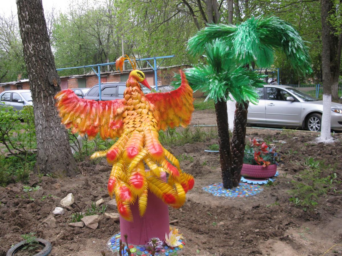 Часто хожу мимо этого дворика, довольно наивно и неуклюже все сделано. Только наклонная цаплястраус получилась пластичная, душевная. Но. у кого то неплохая техника работы с мягкими материалами, я так понял там многое из стаканчиков сделано или подобного пластика. В сумме хоть и пестро - но мило. И главное что не смотря на кучу праздношатающихся подростков, алкашей и гастарбайтеров, дворик не тронут.