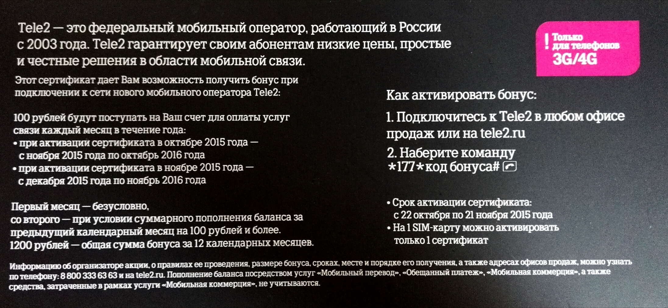 Да, все ок. Дают бабло в течение года и 01.11.2015г. +100 на баланс, т.к. сертификат активирован был. В метро не ловит, для подмосквичей это не особая проблема, к тому же есть бесплатные помощницы - мегафон и мтс. Москвичам даже 4G в метро не делают, говорят WIFI хватит... любят тусить под землей, катаясь в метро по кольцу ради WIFI