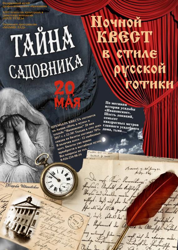 https://vk.com/taynasadovnikaПРЕМЬЕРА КВЕСТА состоится на Акции Ночь в музее в усадьбе "Ивановское" 20 мая 2017 г. с 22:30! Только в этот день скидка на билеты составит 70%. В наличии всего - 12 свободных мест. Билеты уже можно приобрести в вестибюле музея. Все вопросы по тел. - 8-926-234-98-34