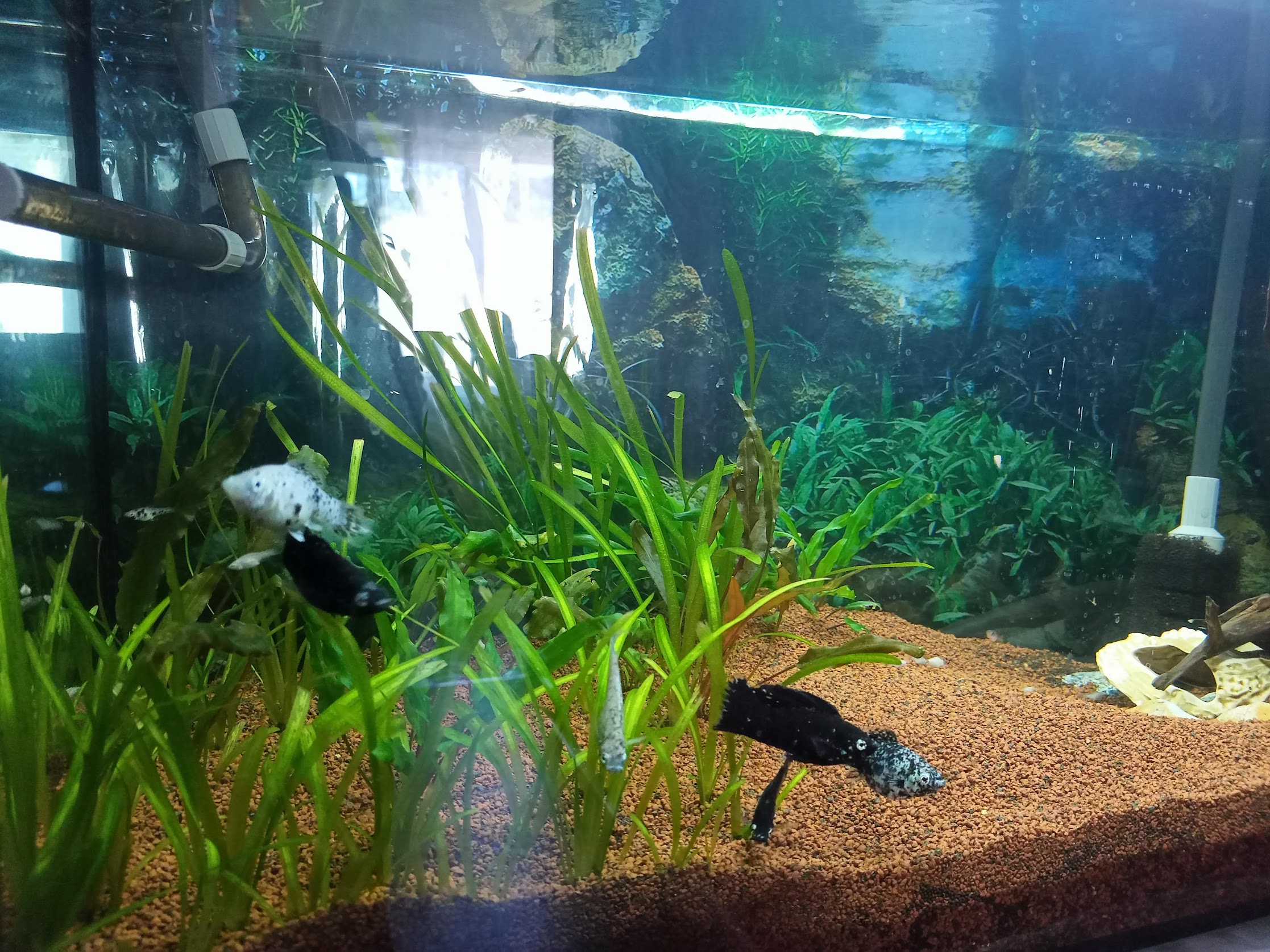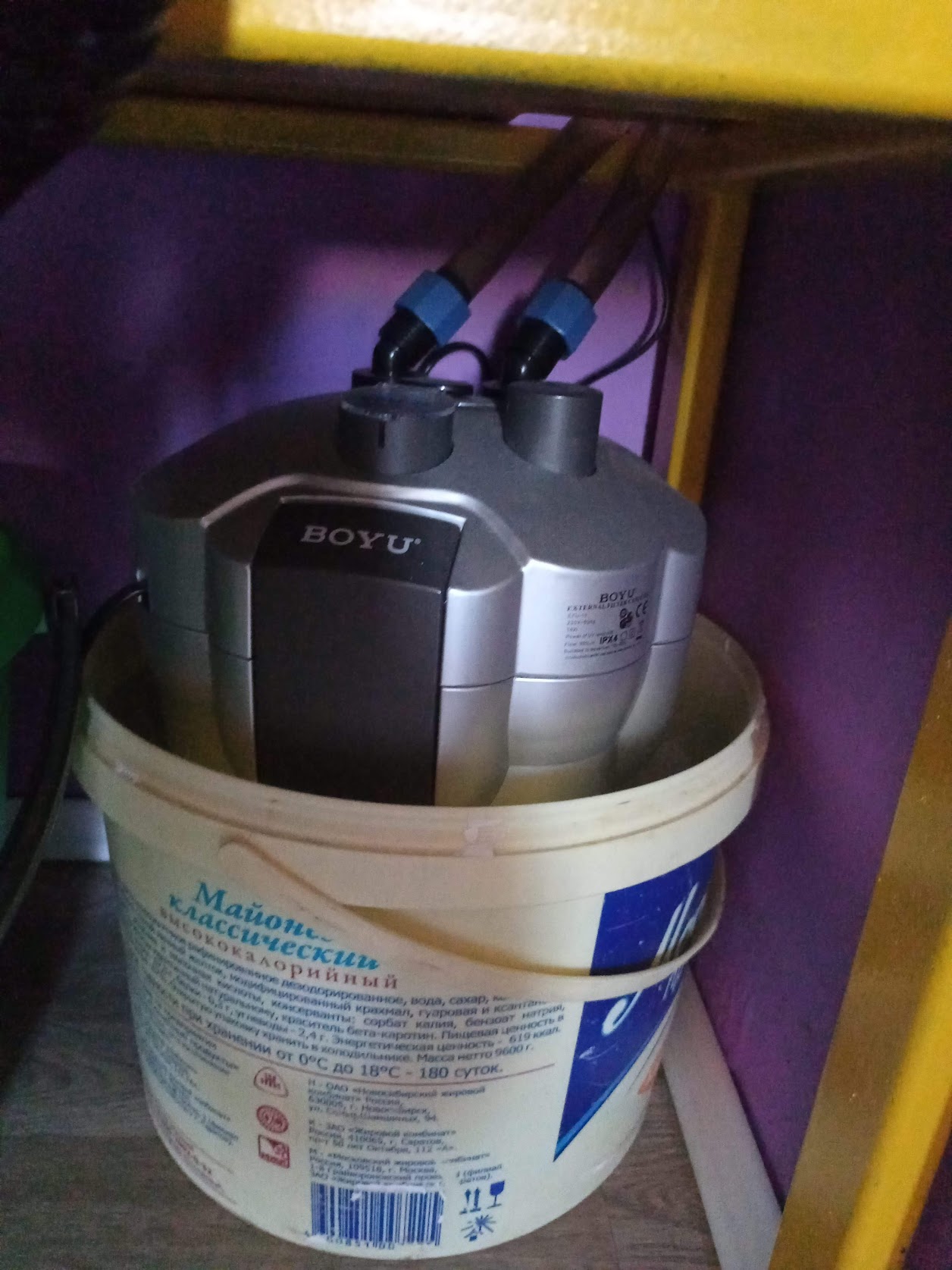 По началу был фильтр SunSun 603 - он не справился, приобрел у аквариумиста на Октябрьском BOYU, были гуппи, расплодились до жути, видимо для них слишком хорошие условия, пришлось выводить их всех.