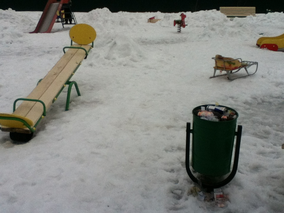 на детской площадке убирать мусор из урн (лежит с прошлого года), и зачем уборщики складывают на ней снег в пирамиды