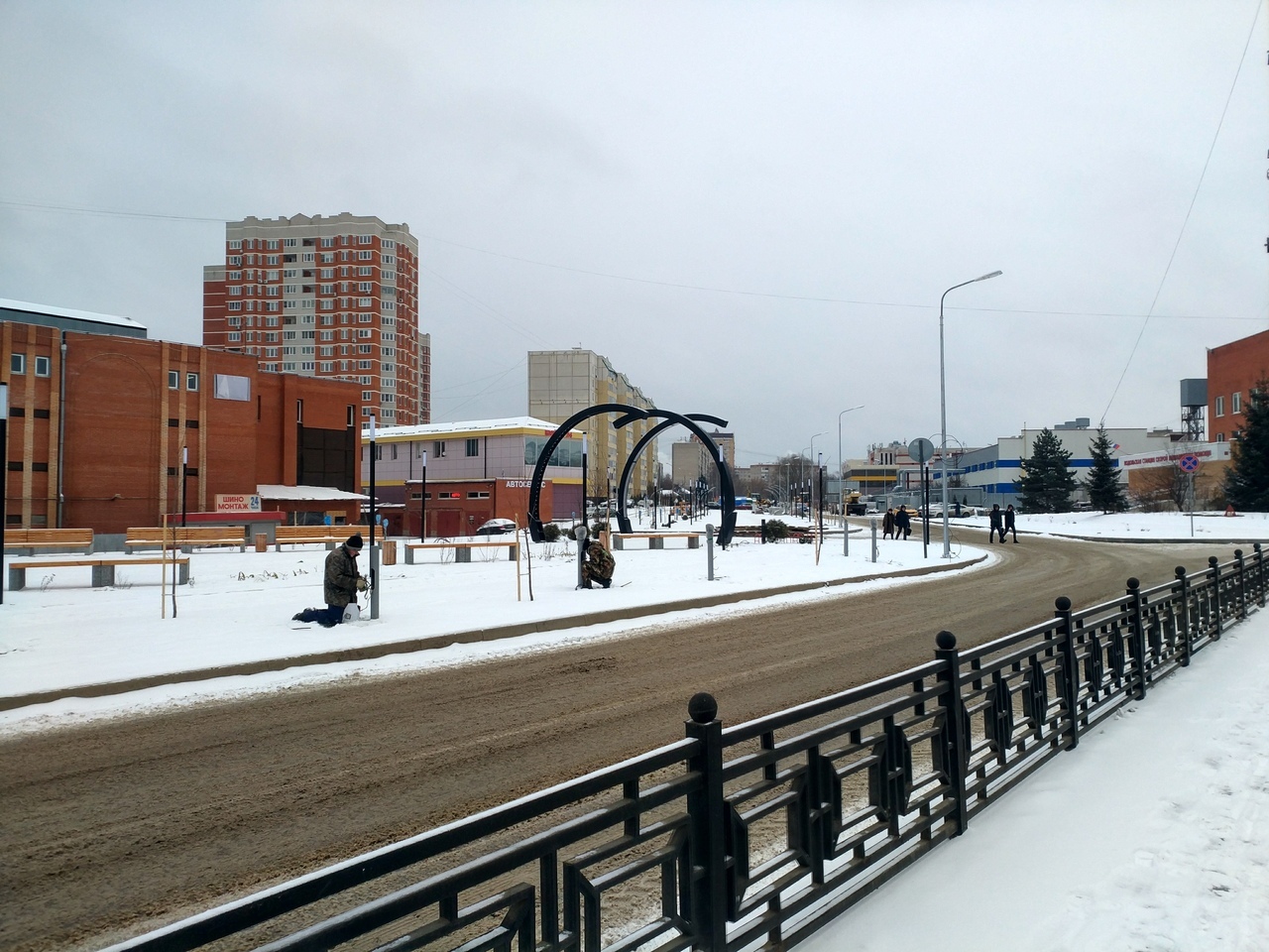В мороз кладут брусчатку, в снегу прикручивают провода к крутейшим светильникам на бульваре "Молодой Подольск".