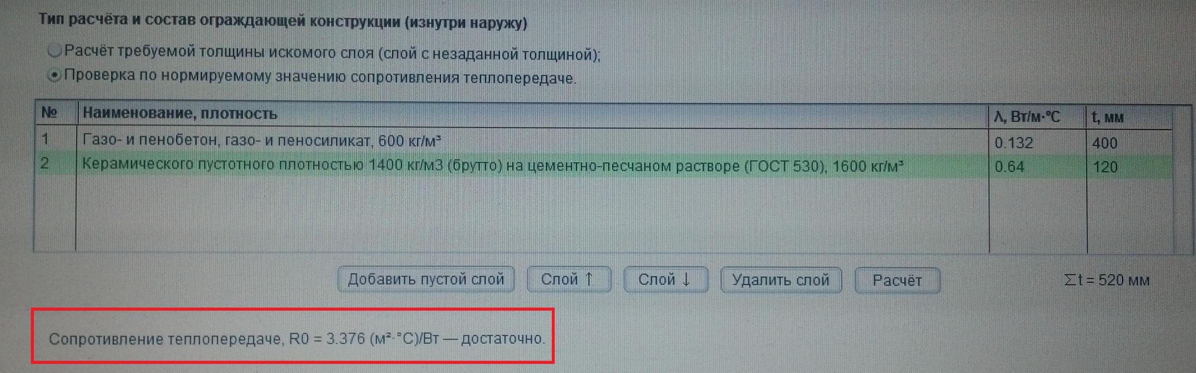 Приветствую! Надеюсь ещё актуально... По поводу невозможности выполнить кладку 510 мм из данных блоков я писал выше...DLove писал(а): Сделайте теплотехнический расчет, с учетом того,что написали и продемострируйте, что стены,выполненные по факту не соответствуют требованиям нормативной документации, а то получается текст из множества умных слов,забыли упомянуть про паропроницаемость,разность парциальных давлений,коэффициент теплотехнической однородности и тд. Производитель блоков YTONG ,например, заявляет,что их блоков D500 достаточно 375 мм,для выполнения требований нормативов, а тут 400 мм, плюс облицовочный пустотелый кирпич 120 мм и этого не достаточно,странно. Я сколько проектов домов не делал и не видел, нигде не встречал стену из пеноблока в пол метра, везде делается 400 мм плюс утеплитель или облицовка, к тому же выполнить кладку из блоков в 510 мм физически не возможно. И ещё, некоторые производители указывают теплопроводность материалов в сухом и влажном состоянии. Я вот выполнил в программе теплотехнический расчет данной стены с средними параметрами и у меня все прекрасно проходит,даже с запасом.