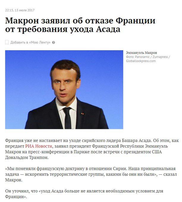 Как отмечает издание Daily Beast, Вашингтон поддержит создание зон безопасности в стране, которые были предложены Москвой, а также не будут возражать против патрулирования ряда районов страны российскими военными. Вместе с тем, США не будут вводить войска на подконтрольные Асаду территории, а районы, которые были освобождены силами сирийской оппозиции, будут находиться под их контролем. https://rg.ru/2017/07/07/smi-ssha-sogla ... sirii.html