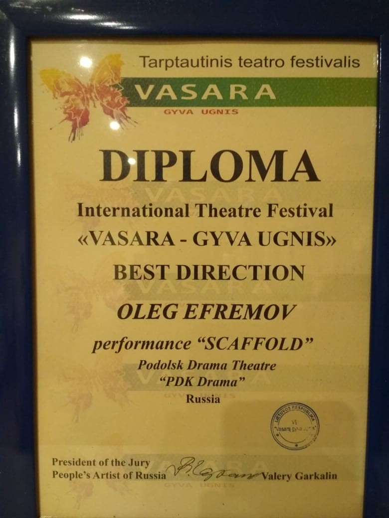 "VASARA - GYVA UGNIS" в Литве за спектакль "Плаха" стал победителем в номинации "Лучшая режиссура". Председатель жюри Народный артист РФ Валерий Гаркалин.