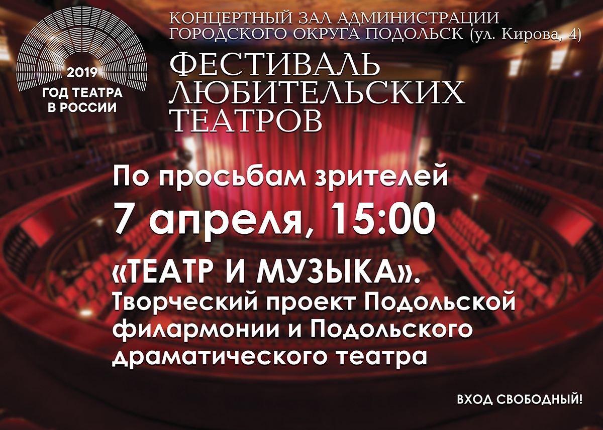 В рамках фестиваля любительских театров «В гостях у Мельпомены» и Года театра в России. Творческий проект Подольской филармонии и Подольского драматического театра «Театр и музыка». Концертный зал Администрации: Подольск, ул. Кирова, д. 4,